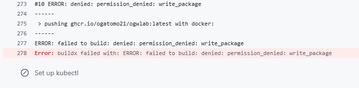 また初っ端からエラーです。どうやら権限がなくイメージのプッシュが出来ないようです。