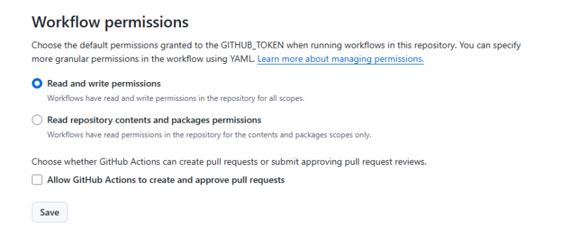 いつも通り リポジトリの設定→Actions→General→Workflow permissions から書き込み権限を与えるも変わらず...