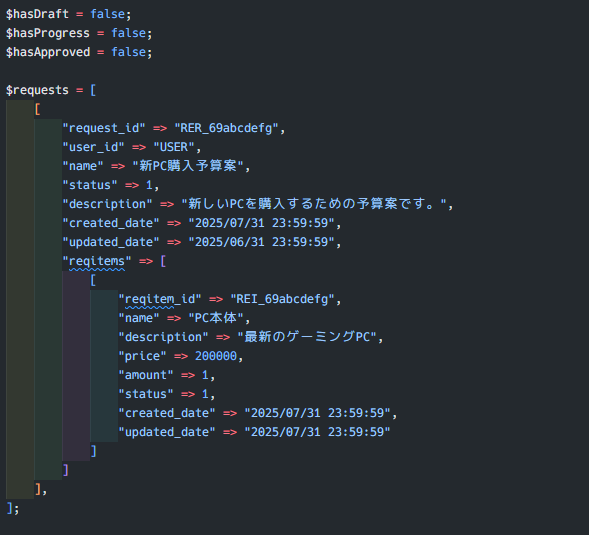 とはいえ現段階からDBをぶち込むと大変なので、仮で同じようなデータが入った配列を作り、それを読み込んでいきます。