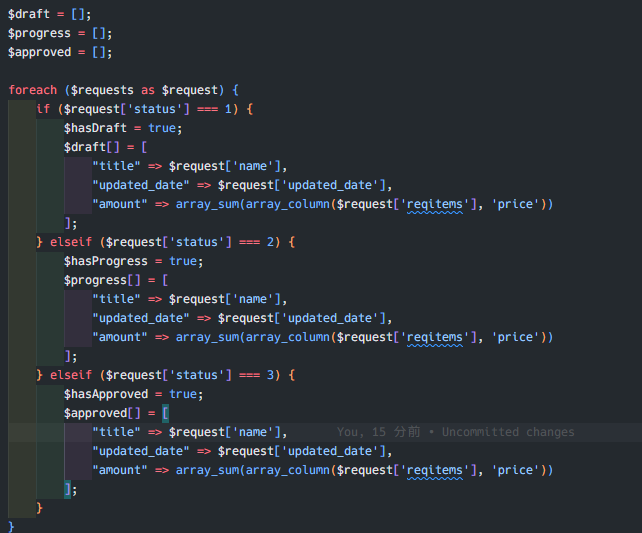 $requests という配列にDBと同じような事前にデータを突っ込んでおいて、 foreach 関数で status の数字を見ながらぶん回して $draft 配列、 $progress 配列、 $approved 配列に入れてます。