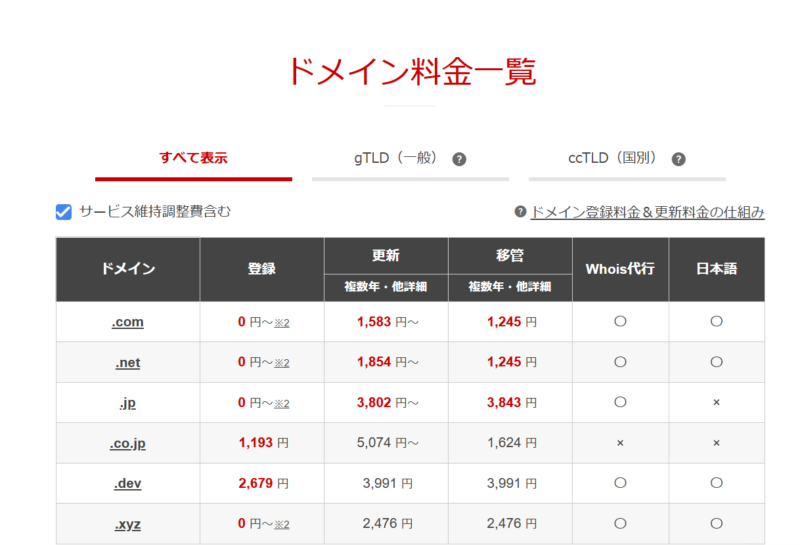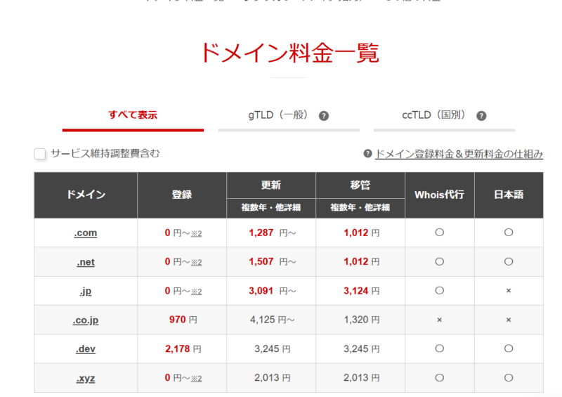 | .co.jp | 4,125円~ | 5,074円~ | 949円 |
