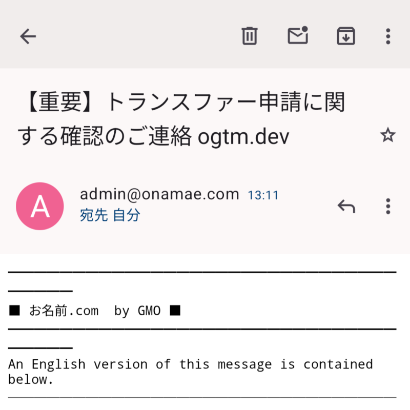 ドメイン代金を決済して30分くらい待つと、移管元レジストラ(お名前.com)から「移管するけどええか?」的な確認メールが届きます。