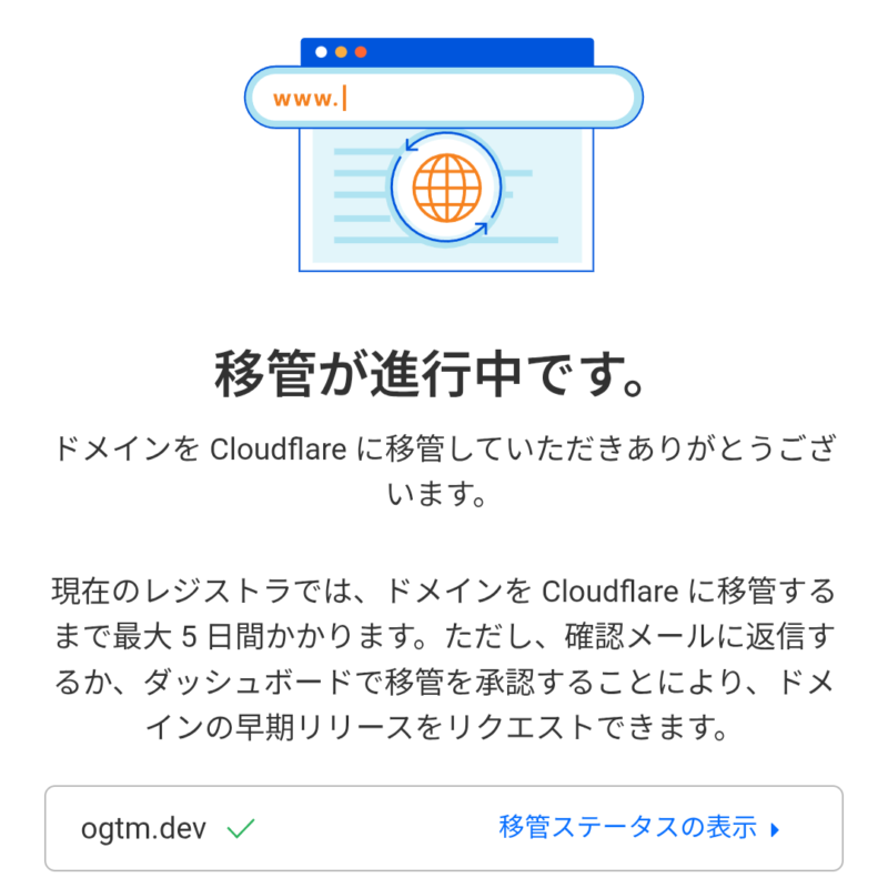 承認してからちょっとすると今度はCloudflareから移管が完了した旨のメールが届きます。
