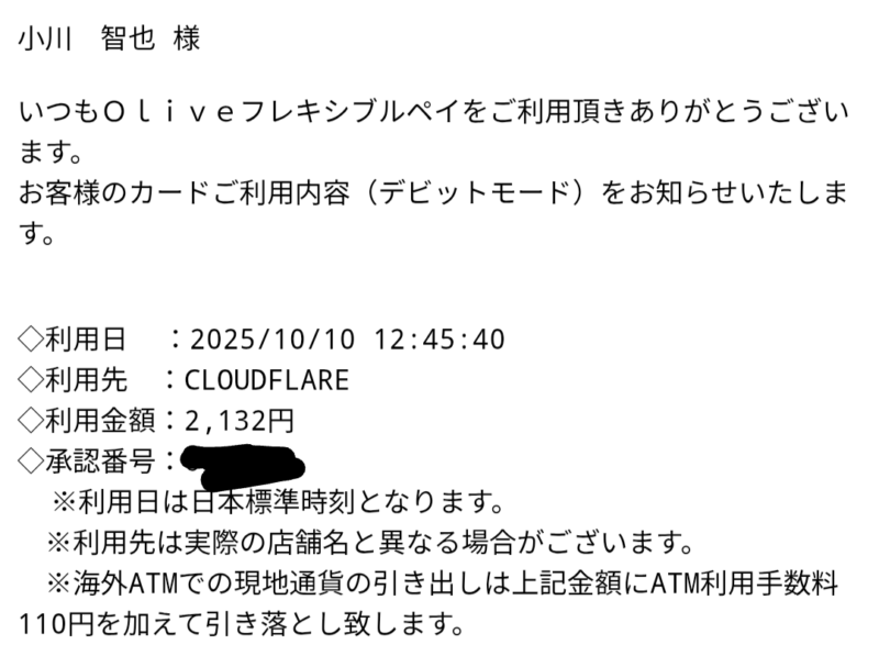お名前.comだとコンビニ払いや銀行振込も使えるのですが、CloudflareはカードかPayPal(カード紐づけといて楽に払えるやつ)だけです。