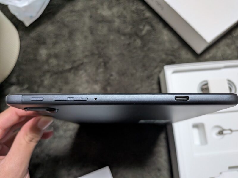 左側面には左から、電源ボタン、音量+、音量-、マイク、そして一番右側にUSB Type-Cポートがあります。