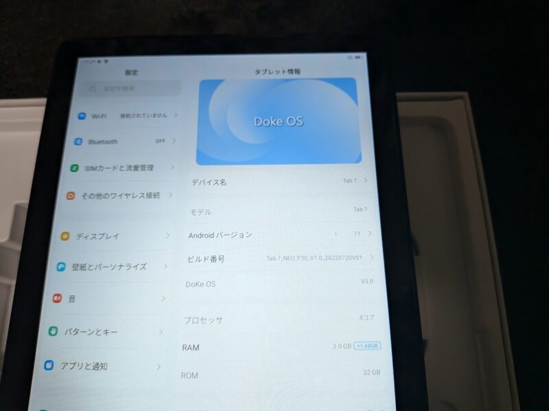 設定画面はこんな感じです。OSにはAndroid 11ベースのDoke OS 3.0が使われていて、基本的なスペックは下記のとおりになっています。